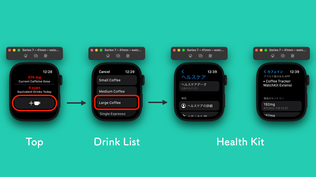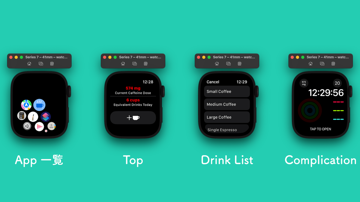 アプリは摂取したカフェイン量を確認する画面と、摂取した飲み物を選択する画面から構成されています。その他、コンプリケーションも用意されていますが、今回の移行においてはおまけと捉えてよいでしょう。