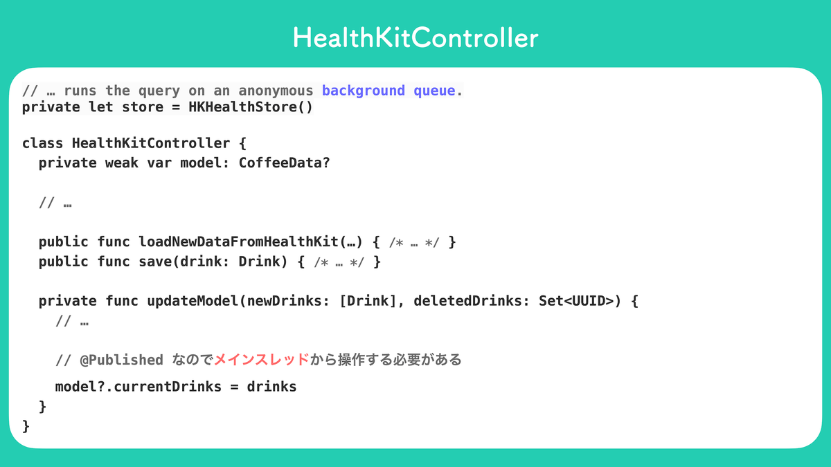 HealthKitControllerクラス内で HealthKit からのコールバック処理を経由してCoffeeDataクラスのプロパティを操作している。CoffeeDataクラスのプロパティcurrentDrinksはメインスレッドから操作する必要がある- HealthKit のコールバック処理はバックグラウンド上で行われる