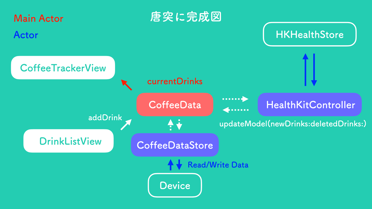 上記の観点を整理すると、CoffeeData クラスは、メインスレッドとバックグラウンドスレッド上の処理をそれぞれ MainActor と Actor として分離することができます。currentDrinks プロパティは MainActor となった CoffeeData クラスが保持するようになり、Actor となった HealthKitController クラスからは、必要な情報を添えて CoffeeData クラスにコミュニケーションをするという構造になっています。