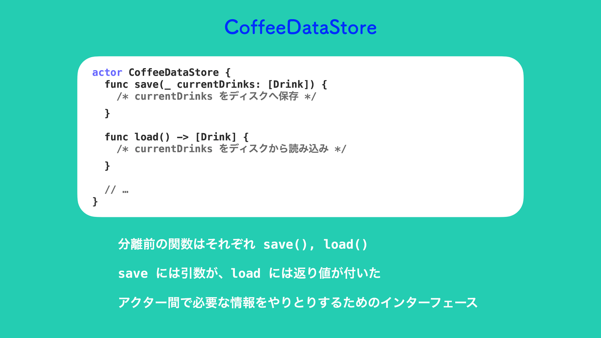 元々 CoffeeData クラスの内部で行われていたディスクへの書き込み/読み込み処理は、Actor である CoffeeDataStore に切り出されました。CoffeeDataStore は CoffeeData が private なプロパティとして保持していて、バックグラウンドで処理を行いたいという意図も分かりやすくなりました。