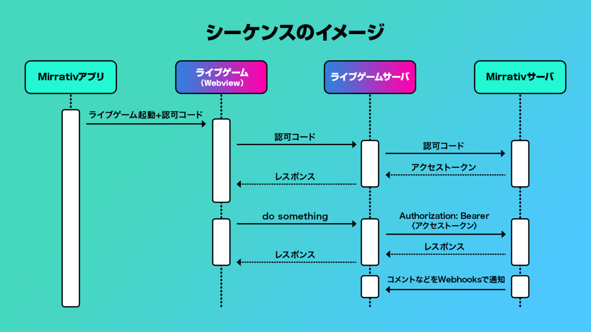 ライブゲームのバックエンドサーバは、ゲームデータの管理を行いつつ、Mirrativが提供するライブゲームAPI (OpenID Connect) を介して、ユーザー情報取得やユーザー招待、コメント投稿などを行います 。