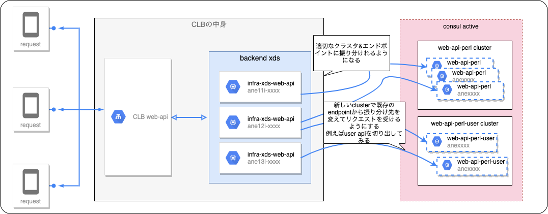 Yaml ファイルの定義なので分かりづらいのですが、CDSおよびEDSとRDSの連携は 既存の consul クラスタ(Service名)でマッピングするようにして(web-api-perlやweb-api-go という ServiceName のクラスタが存在します)、なるべく複雑にならないように Consul で使用しているものをそのまま利用するように定義にしています